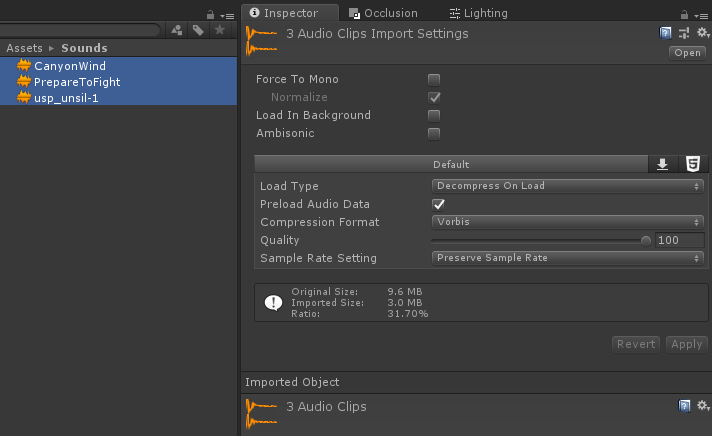 Ad esempio, nel mio progetto, ho 3 suoni con scopi diversi e, come puoi vedere, tutti hanno impostazioni di importazione predefinite che non sono adatte a tutti i tipi di suono.